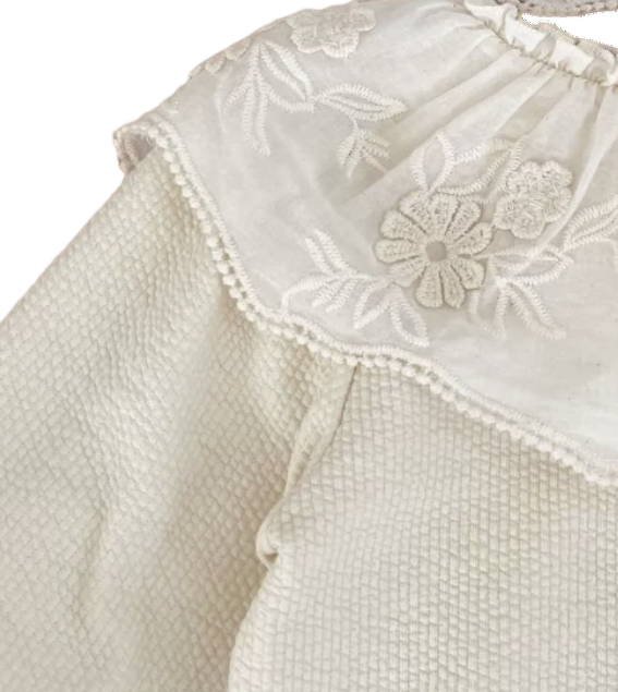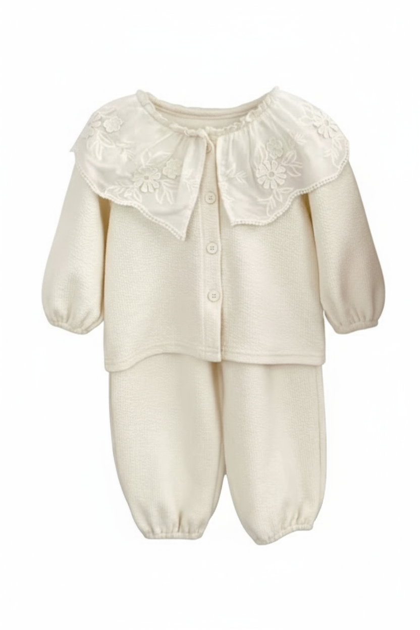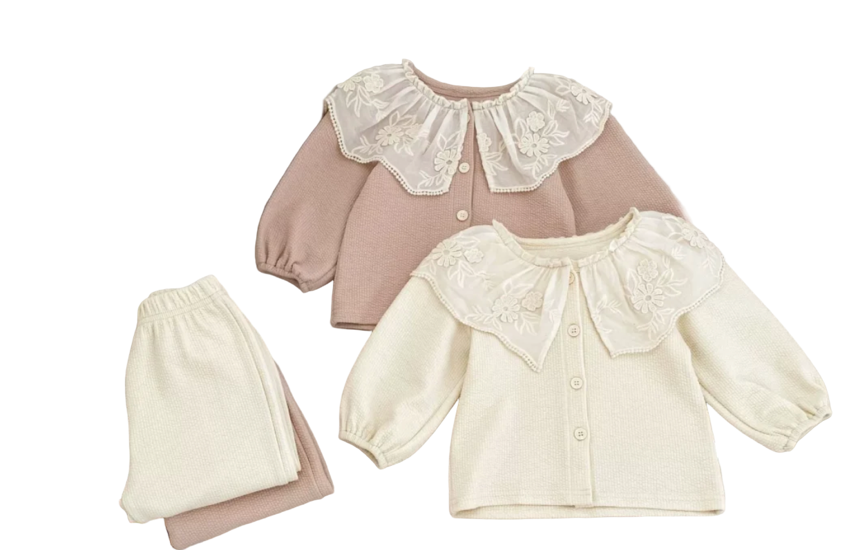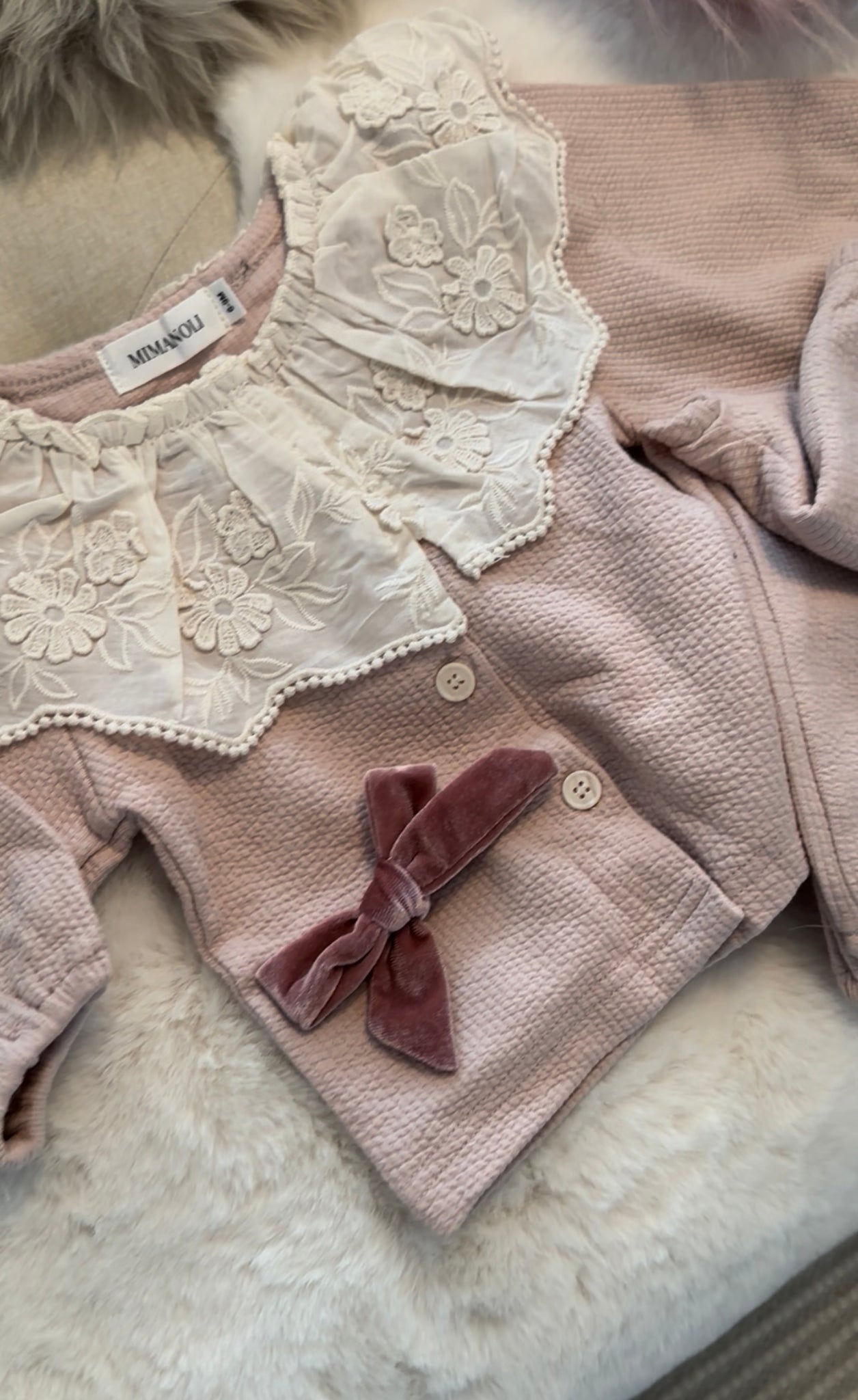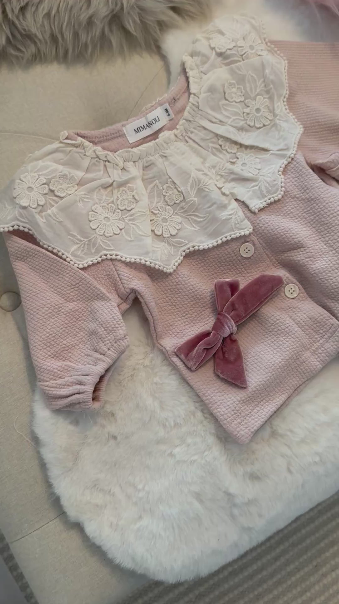 Soft ribbed pink cotton. A two piece with oversized collar and cream embroidered frill neckline